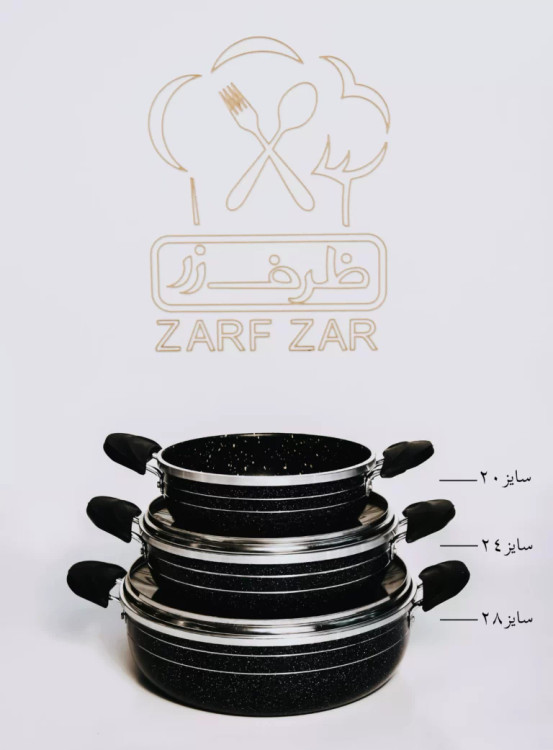 سایز قابلمه ها ۲۰ و ۲۴ و ۲۸ و یک ماهیتابه سایز ۲۸ بعلاوه سه عدد درب
