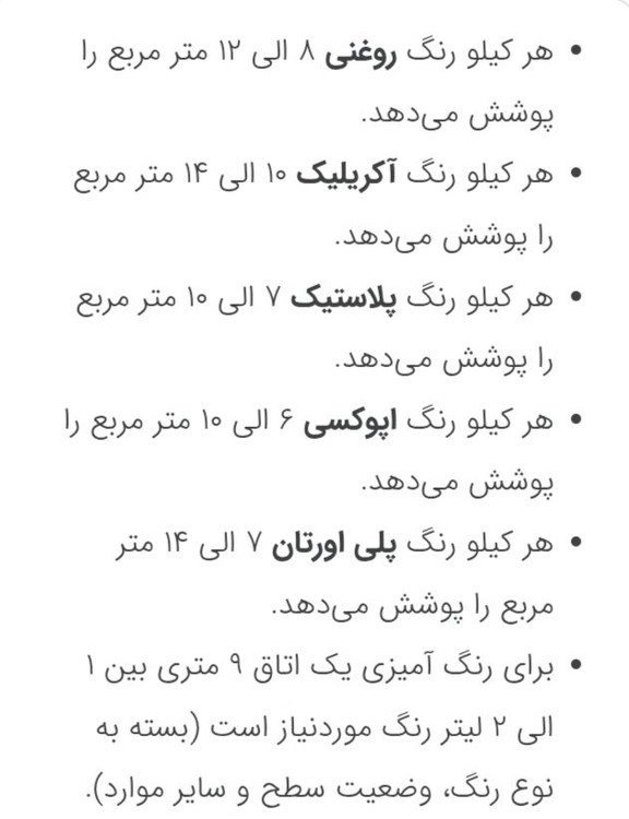 هر یک کیلو رنگ تقریبا برای رنگ امیزی ۱۲ متر مربع برای یک دست کافی می باشد البته با توجه به کثیفی و سابقه رنگ قبلی پیشنهاد می شود حداقل دو دست رنگ آمیزی شود.